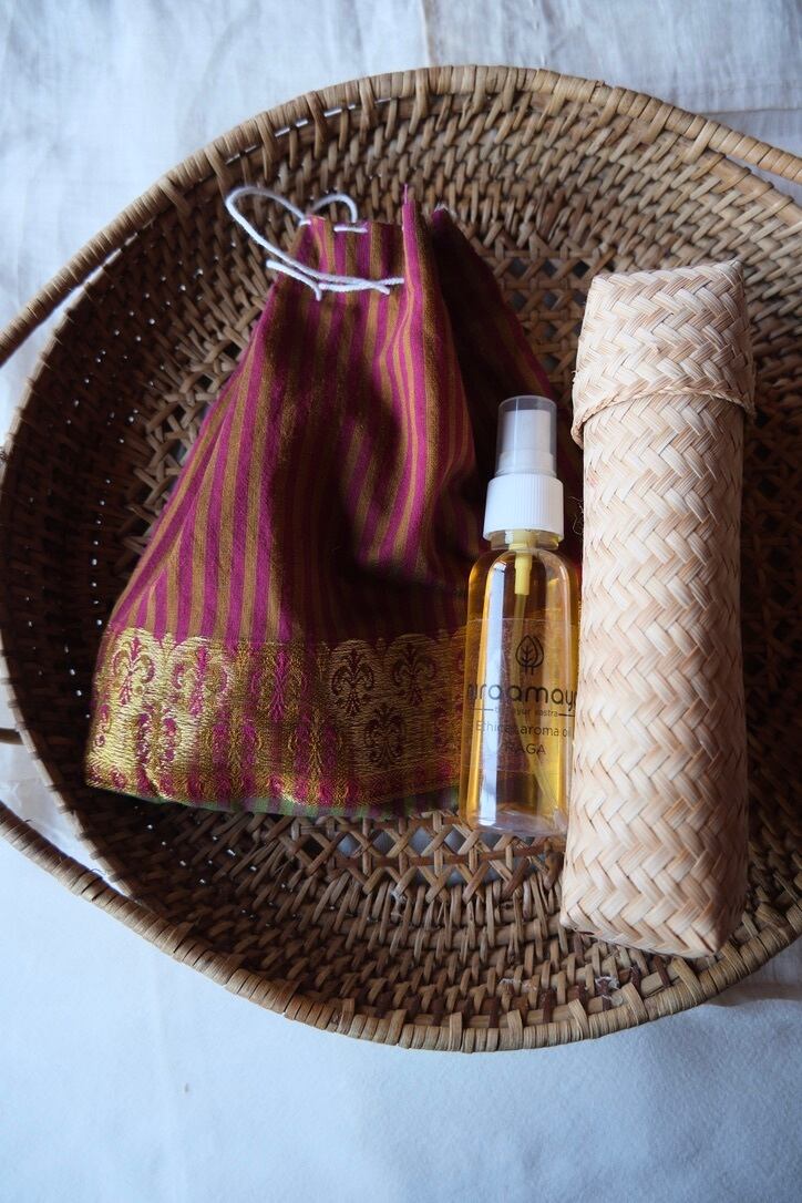 チェンマイで見つけたぴったりサイズの竹細工とインドの街で見つけたかわいい巾着袋もセットです!